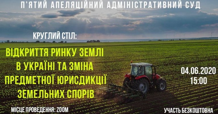 На незалежній та відкритій для альтернативних думок платформі П'ятий апеляційний адміністративний суд запрошує Вас взяти участь у круглому столі «Відкриття ринку землі та зміна предметної юрисдикції земельних спорів» та долучитися до фахового обговорення проекту Закону України №3296 від 31.03.2020 "Про внесення змін до Господарського процесуального кодексу України щодо підвідомчості спорів, що виникають у сфері земельних відносин та спорів щодо нерухомого майна".